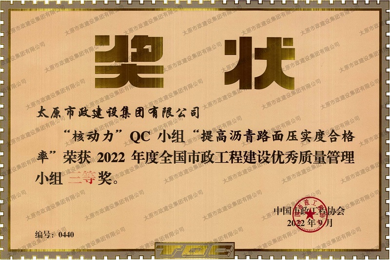 資質(zhì)證書 營業(yè)執(zhí)照 2022年度市政工程最高質(zhì)量水平評(píng)價(jià)_H5-1路道路及配套工程(二標(biāo)段) 2022年度工程建設(shè)誠信典型企業(yè) 中國施工企業(yè)管理協(xié)會(huì)_AAA級(jí)企業(yè)信用等級(jí) 2022年度全國市政工程建設(shè)優(yōu)秀質(zhì)量管理小組三等獎(jiǎng)_''核動(dòng)力QC小組”提高瀝青路面壓實(shí)度合格率”